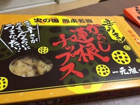 お土産。 ポスト 2016年3月4日 みなさん、こんにちは(^^)v昨日の日記で、毎年恒例の総会がありました。と書いたのですがその帰りに、熊本で以前貰った『れんこんチップス』が美味しくて忘れられなかったので自分のお土産用に買って帰りました☆みなさん、これ知ってますか?ピリ辛ですけど、やみつきになります(^o^)ぜひ、熊本に行ったときは買ってみてください!!ビールとの相性も最高です!! 担当:新山