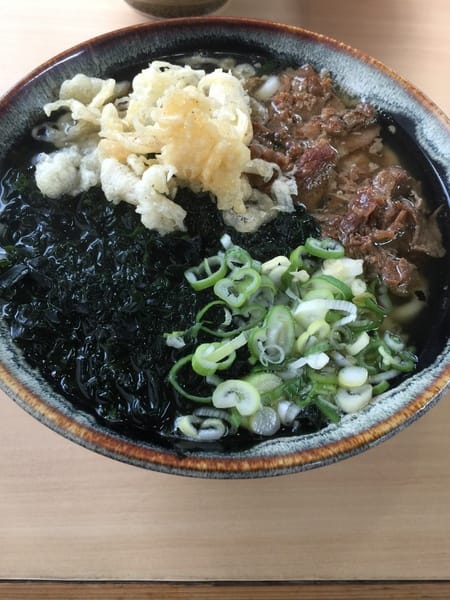 肉うどんに、わかめ、天かす、トッピング!!!!