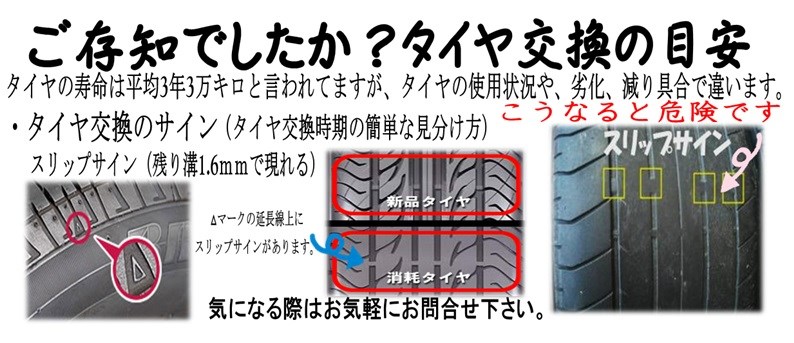 ☆タイヤの交換目安☆ ポスト 2017年7月14日 こんにちは!タイヤ館都城店の畑田です!! お車の「タイヤ残り溝」ってご覧になられたことありますか?? 溝が無い状態で走行されると危険です!!! タイヤ館都城では、無料でタイヤチェックを致します!! 不安な方や、気になる方は是非ご来店下さい☆☆ カテゴリ:その他 担当:畑田