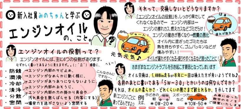 ☆エンジンオイルについて☆ ポスト 2017年9月4日 こんにちは!タイヤ館都城店の畑田です!! エンジンオイル交換の目安ってご存知ですか!? オイルの種類にもよりますが、基本は5,000kmまたは半年に1回が目安です。 エンジンオイルの交換を忘れると、燃費の悪化などにも繋がります!! また、オイルの種類もいろいろあり固さも違うんです!! タイヤ館都城では、お車にあったオイルをご提案致します!!! カテゴリ:その他 担当:畑田