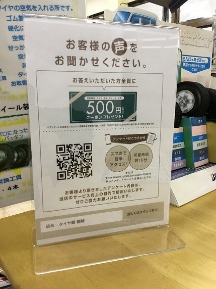 500円クーポンプレゼント♪♪ ポスト 2019年1月30日 こんにちは!タイヤ館都城店の畑田です!^^ ただいま、WEBでアンケートをお願いしております! アンケートにご協力頂くと「500円割引のクーポン券」をプレゼント♪♪ ぜひ、ご協力お願い致します!!!! ※お客様より頂きましたアンケート内容は、当店のサービス向上の目的で 使用いたします! 担当:畑田