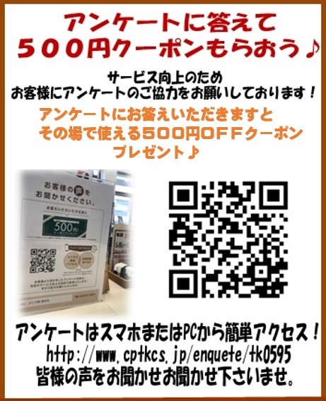 500円クーポンプレゼント♪ ポスト 2019年4月29日 こんにちは!タイヤ館都城店の畑田です!☆ ただいま、タイヤ館ではサービス向上の為にアンケートのご協力を お願いしております! アンケートにご協力いただいた方には 「その場で使える!500円OFFクーポン」をプレゼント♪ ぜひ、ご協力よろしくお願い致します! 詳しくは、スタッフまでお尋ねください^^ 担当:畑田