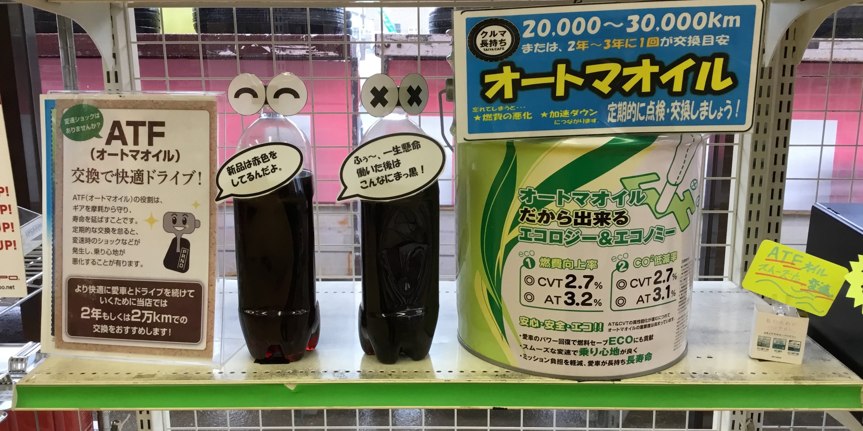 オートマオイル(ATF) ポスト オートマオイルは、エンジンオイルとは違って「ギアのオイル」です! ギアを摩擦から守り、寿命を延ばしてくれる役割があります。 オートマオイルが劣化すると・・・ ☆燃費の悪化 ☆加速ダウン につながります!! 交換目安は2年 または 2万km になっております! タイヤ館都城店では、無料で点検をおこなってます! 気になった方はぜひ点検だけでもお気軽にどうぞ♪ カテゴリ:商品情報 その他メンテナンス