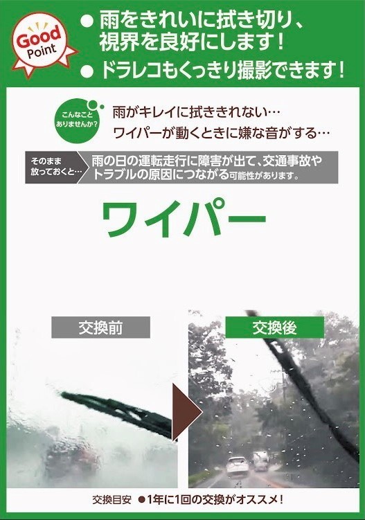 ワイパー ポスト ワイパー1年に1回の交換をオススメします! 点検定期的にされてますか? 交換時期になると、こんな症状が出てきます。。。 ★雨がキレイに拭ききれない ★ワイパーが動くときに嫌な音がする そのまま放っておくと。。。 雨の日の運転走行に障害が出て、交通事故やトラブルの原因に繋がる可能性があります! 点検だけでもお気軽にどうぞ♪ カテゴリ:商品情報 その他メンテナンス