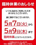 5月7日(火)~9日(木)の3日間は臨時休業致します。