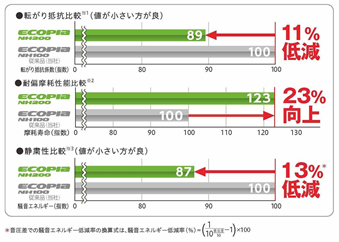 セダン・ミニバン向け「ECOPIA NH200」は、「エコテクノロジー構造」の採用により従来品対比で転がり抵抗が11%低減、「トレッド形状の最適化」、「新パターン」、「エコ効き持ちゴム」の採用により耐偏摩耗性能が23%向上しています。また、静粛性をケアした新パタンの採用により、スムーズなアスファルト面での騒音エネルギー(パタンノイズ)は13%低減しており、転がり抵抗や耐偏摩耗性能の向上だけでなく、車内の静粛性にも配慮した商品となっています。