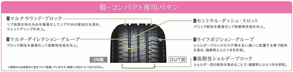 軽・コンパクト専用の「ECOPIA NH200 C」は、「エコテクノロジー構造」の採用により従来品対比で転がり抵抗が6%低減、「トレッド形状の最適化」、「軽・コンパクト専用新パタン」、「エコ効き持ちゴム」により耐偏摩耗性能が25%向上し、摩耗ライフが15%向上。軽・コンパクト車両で特有の小回り・据え切りによる耐摩耗・偏摩耗やふらつきにも配慮した専用設計を行ったことで、さまざまな性能の向上を実現しています。