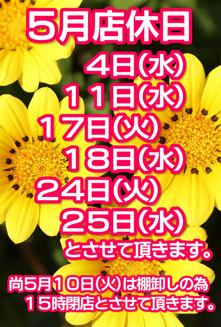 5月24日(火)25日(水)は店休日です。100km点検のお客様はお気をつけ下さい。