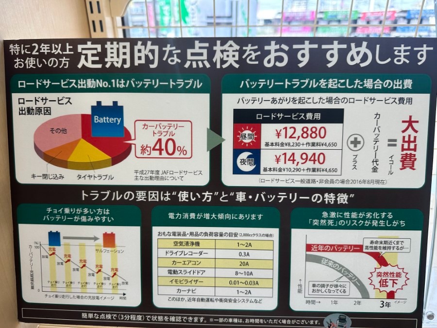 当店では、夏場の外出先でのバッテリートラブル防止の為にお出かけ前のバッテリー無料点検