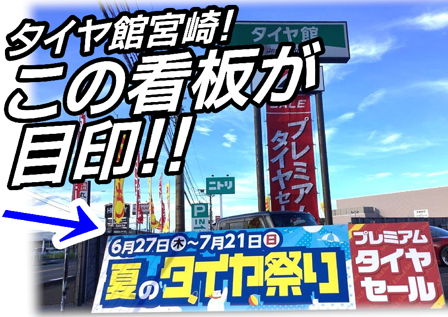 タイヤ館宮崎は 宮崎市新名爪、10号線沿いニトリさんの隣にございます。