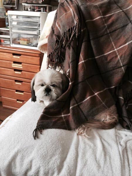 に逃げて、ひざ掛けで隠れるようにしてこっちを見ていました。