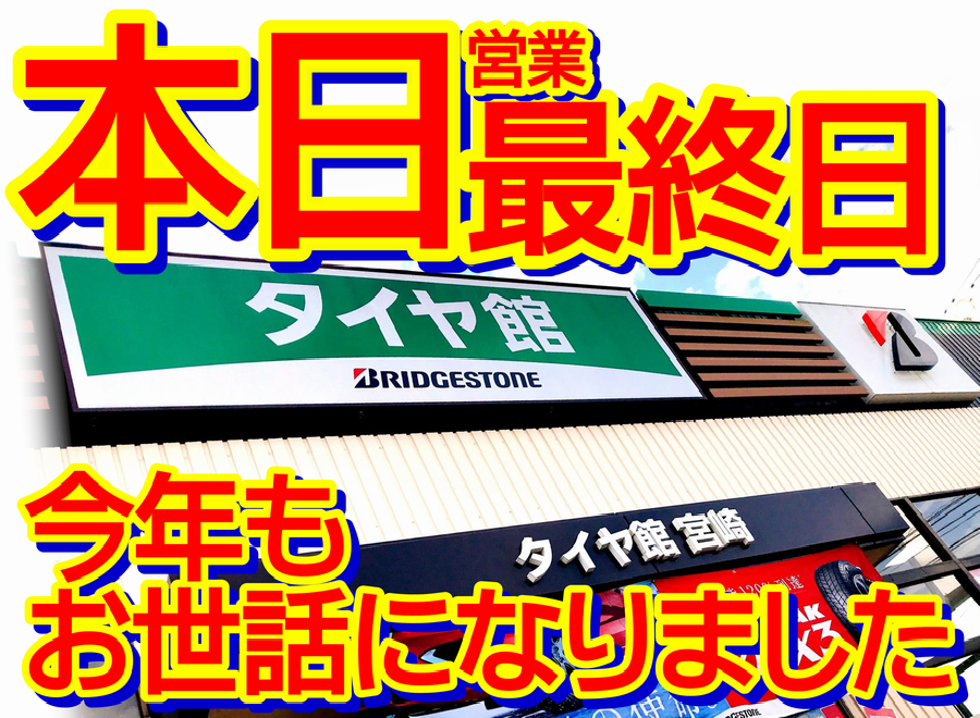 本日!営業最終日!お出かけ前に愛車の点検を!! ポスト 2024年12月30日 今年も遂にこの日が!! 本日営業最終日です!! 2024年! お世話になりました! 2025年もタイヤ館宮崎をどうぞ宜しくお願い致します! 営業は本日までですがお出かけ前の点検も受付中ですので是非ご利用を!! 新春初売り概要はコチラ 2025年始は 1月5日(日)より 恒例の新春初売りを開催致します!! 皆様どうぞよいお年をお迎えください。