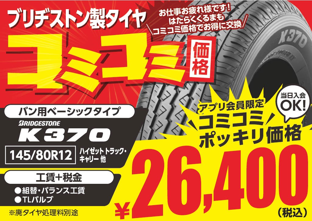 また、K370以外の軽トラ・軽バン用タイヤもお買い得にご案内させていただきますのでご相談お待ちいたしております!