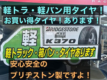 いつも当店HPを閲覧いただきありがとうございます。 本日は軽トラック・軽バン(箱バン)用タイヤのご案内です! タイヤ館宮崎ではお買い得な軽トラ・軽バン用タイヤをご用意いたしております! 中でもお買い得な商品としましてブリヂストン製 k370がお買い得でのご案内となっております! また店...
