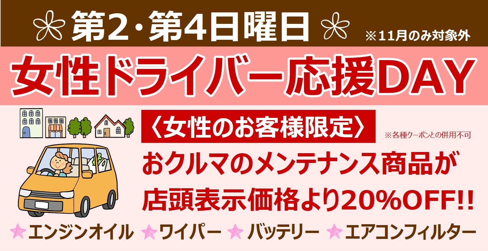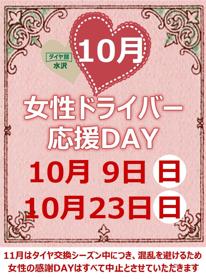 明日10/9(日)は、オトクな〈女性ドライバー応援DAY〉♪