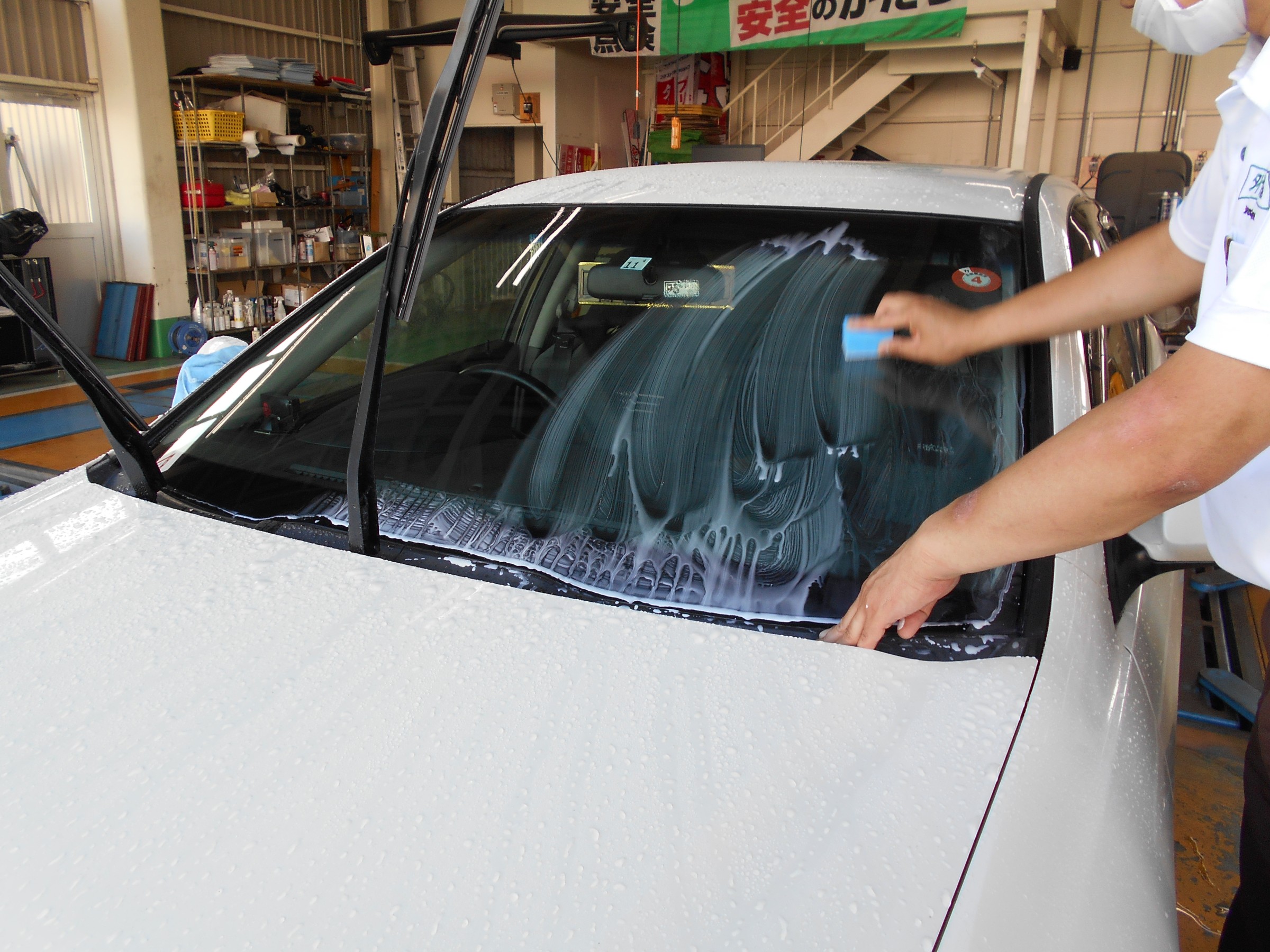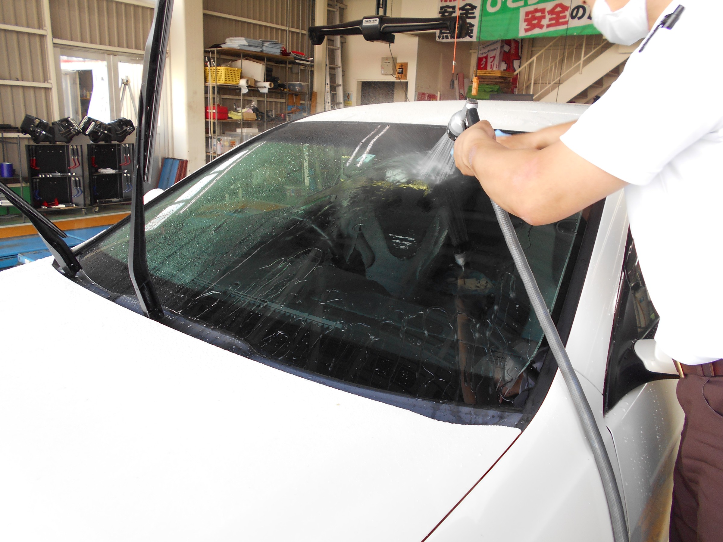 フロントガラスを洗い、