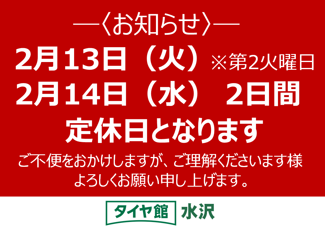 2月13日(火)・2月14日(水)2日間定休日となります