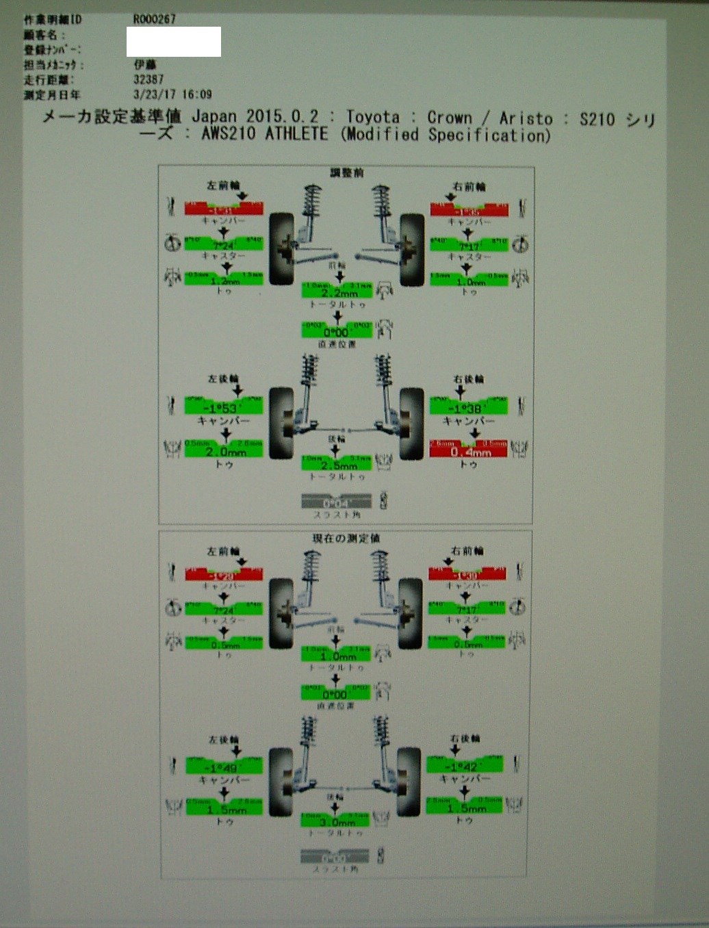 3年たったということで、念のため足回りの健康診断としてアライメント測定を