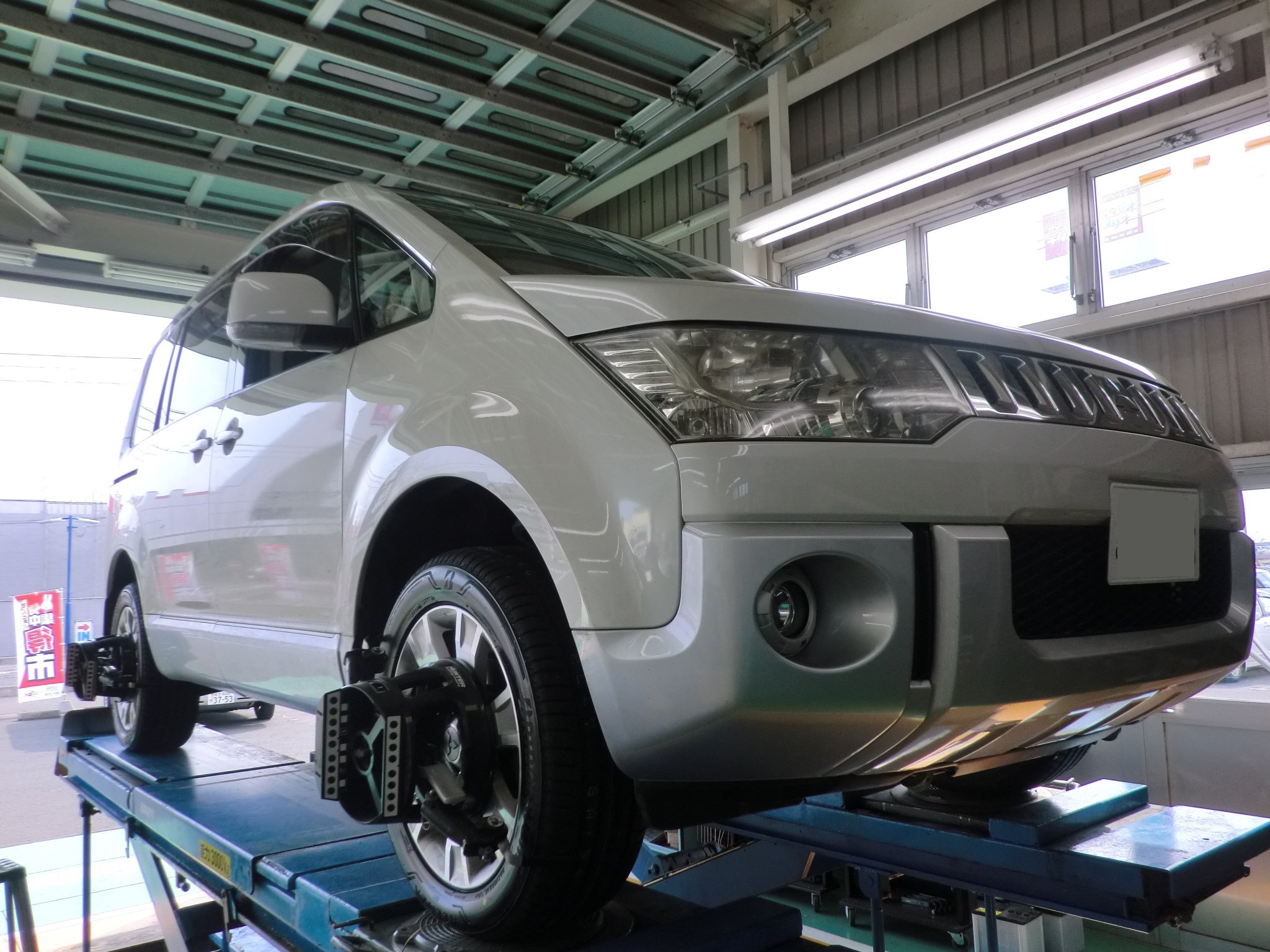 タイヤ交換後、足回りの歪みを矯正するアライメントへ。