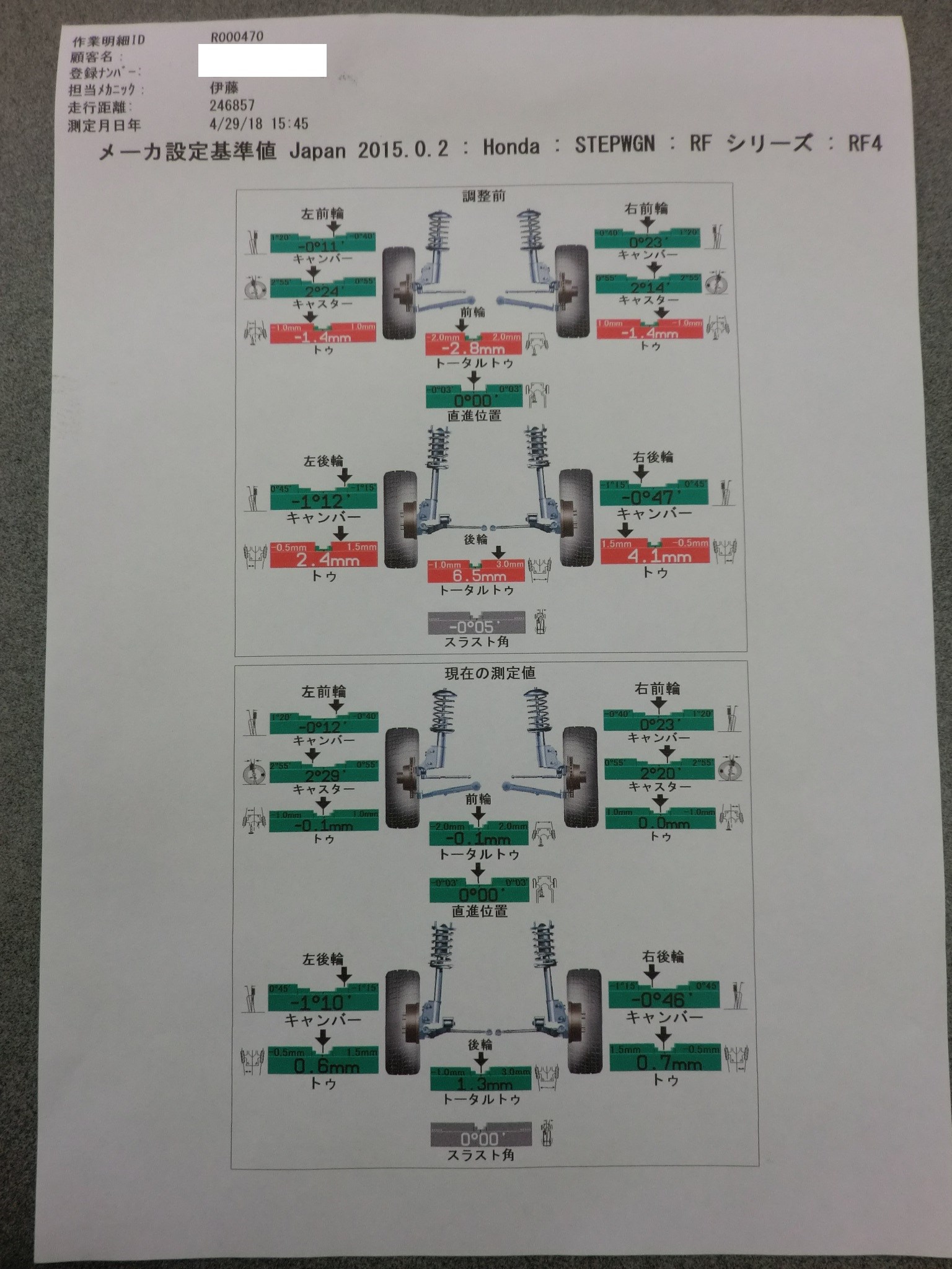 測定結果、歪みが生じておりましたので、スタッフがしっかりと適正な状態へ