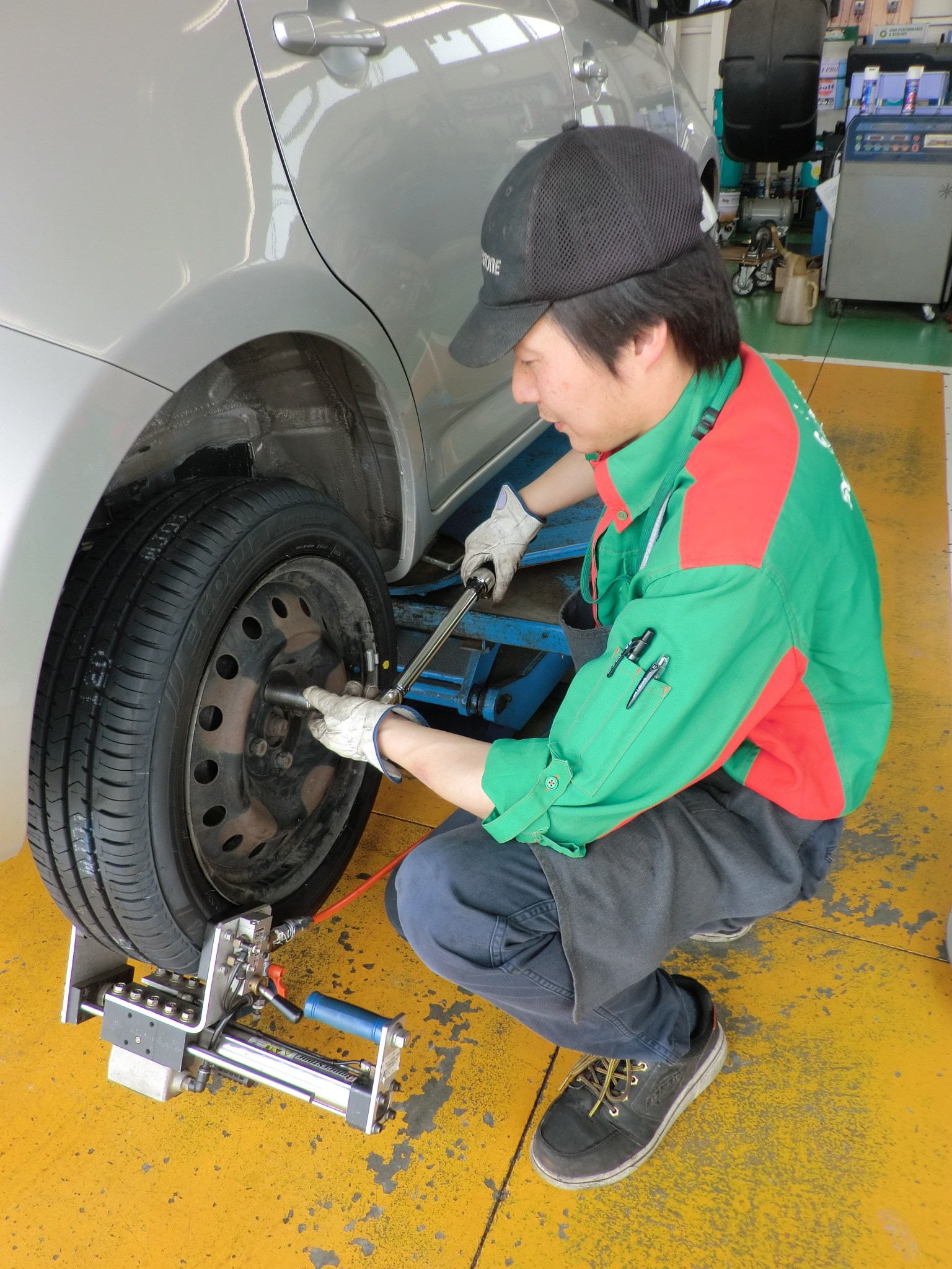 その後、タイヤの取付角度の歪みを矯正する「アライメント」へ。