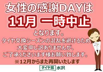 こんにちは(^^)/ 当店では、 〈毎週木曜日〉 レディース・デー + 〈第2・4日曜日〉 女性ドライバー応援DAY と、2種類の 女性の感謝デーを 開催しておりますが…☆ 毎年、 11月だけは タイヤ交換シーズンの 混乱を避けるため、 一時中止と させていただいています。 明日の木曜日は 10月最後の ...