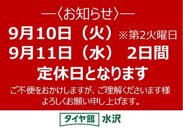 こんにちは(^^)/ いつも 当店のWEBをご覧いただき ありがとうございます! 今週の定休日について 皆さまにお知らせです。 TOPページのお知らせに 記載している通り、 第2火曜日・ 毎週水曜は定休日 となります。 そのため、今週は 9月10日(火) 9月11日(水) 2日間お休み となります。 皆...