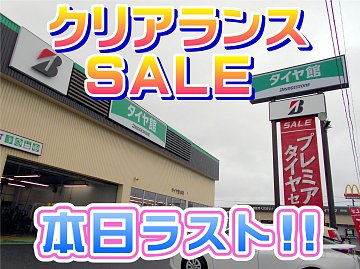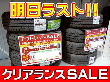 こんにちは(^^)/ 好評開催中の、 水沢店 【クリアランスSALE!】 早いもので、 明日でラスト となりました!!! WEBチラシ掲載品は、 一部完売商品も ありますが、 まだ アウトレット・セール品 がありますよ~!(^^)! 中には、 スタッドレスタイヤの アウトレット・セール品 も! サイズが合えば、...