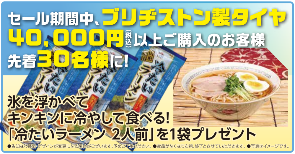 集中得市3日目!! ポスト 2022年7月11日 こんにちは!! 本日は集中得市3日目になります! 人気のタイヤ DAYTON 155/65R14 185/60R15 195/65R15 各3セット 数量限定でご準備しております。 その他タイヤ各種・ホイール・メンテナンス用品などのお問い合わせはスタッフまで!! また ブリヂストン製タイヤ4本ご購入のお客様に 『冷たいラーメン2人前』1袋プレゼントしております。 ※数に限りがございます。 皆様のご来店お待ちしております!! 担当:ころも