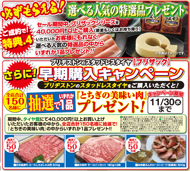 期間中、ブリヂストンタイヤ製品をお買い上げの方先着50名様に