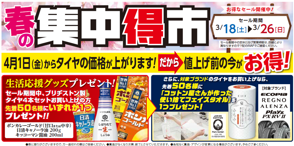 集中得市最終日です!! ポスト 2023年3月26日 こんにちは! 最近、雨が続いていますね( 一一) 本日、集中得市最終日となります!! 4月より夏タイヤが値上げとなっており、残り1週間となっております。 皆様のご来店お待ちしております(^_^) 担当:ころも