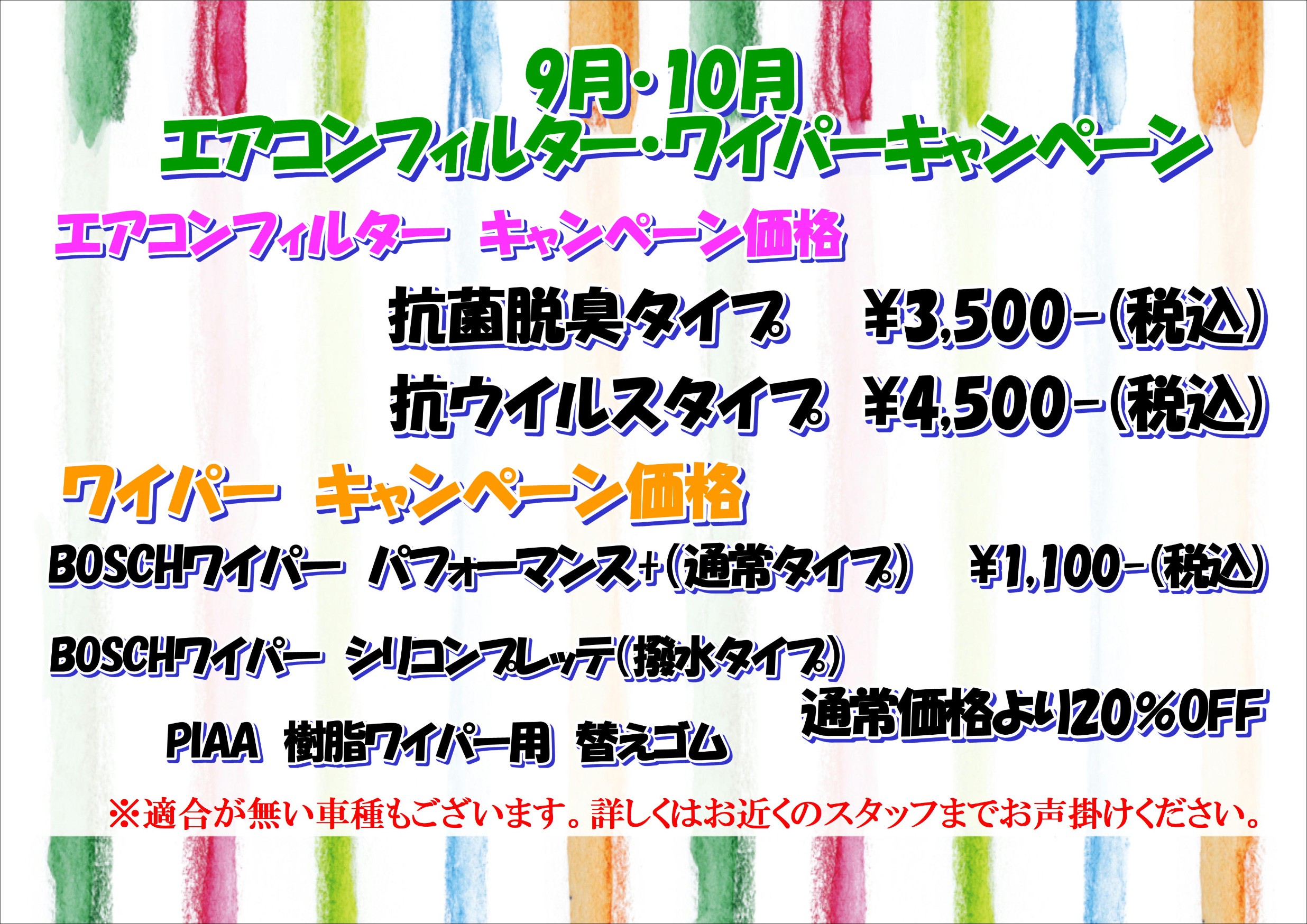 9月・10月はエアコンフィルターとワイパーのキャンペーンを行っております!!