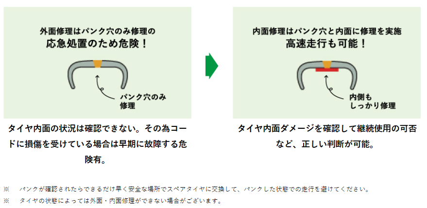 パンク穴をシールすると共に内面からもパッチ貼り付けを行うので