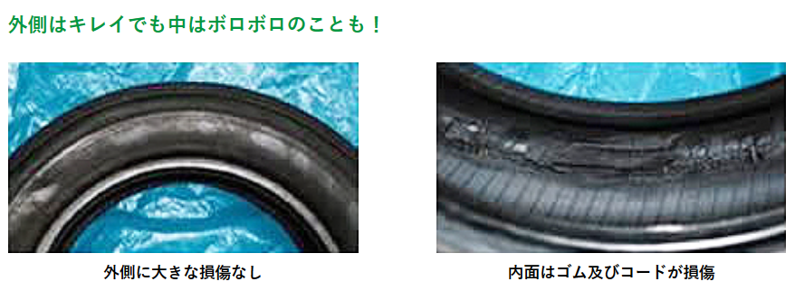 タイヤ内面のダメージを確認してタイヤの継続使用できるかを確認します。