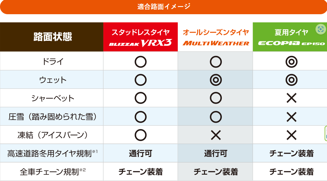 ※ブリヂストンにおける各タイヤの性能特性をイメージした表です。