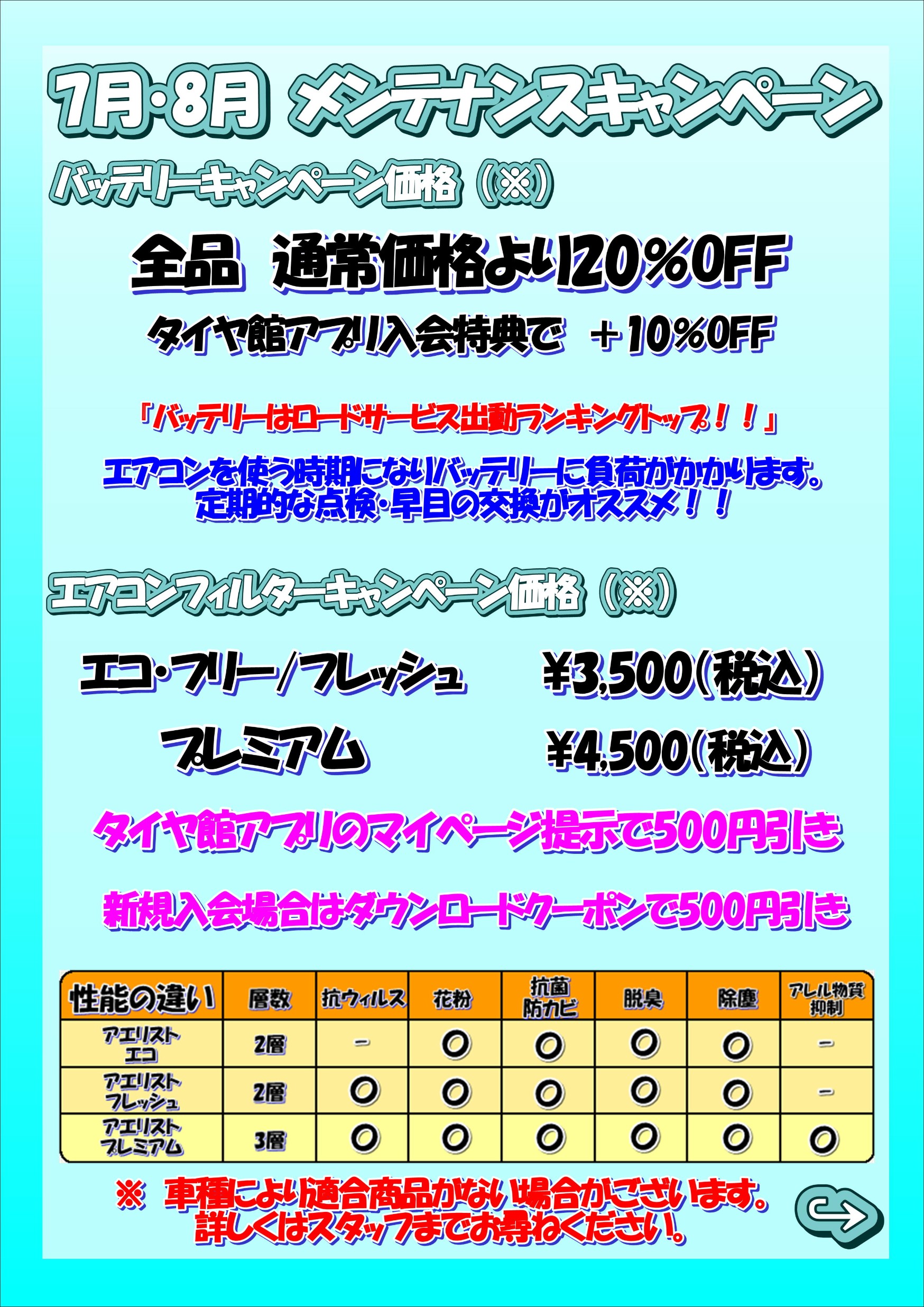 エアコンフィルターとバッテリーキャンペーンです!