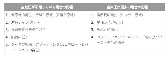 空気圧が適正出ない場合、タイヤにはこういった影響が起きてしまいます。