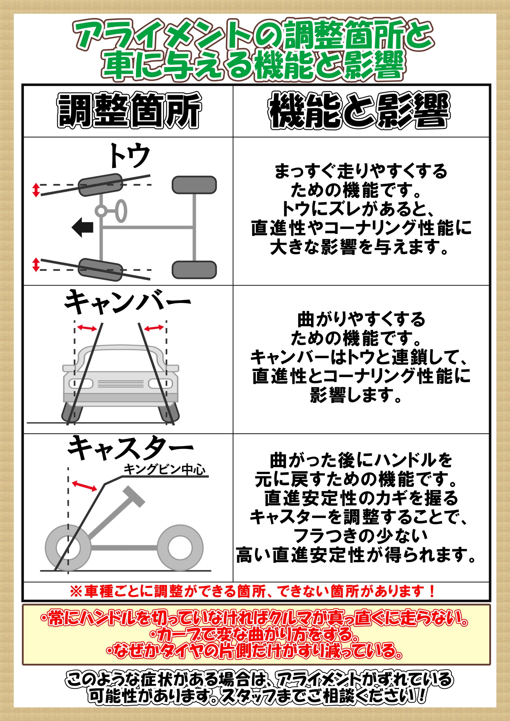 「キャンバー」、「キャスター」が調整できる場合もあります。