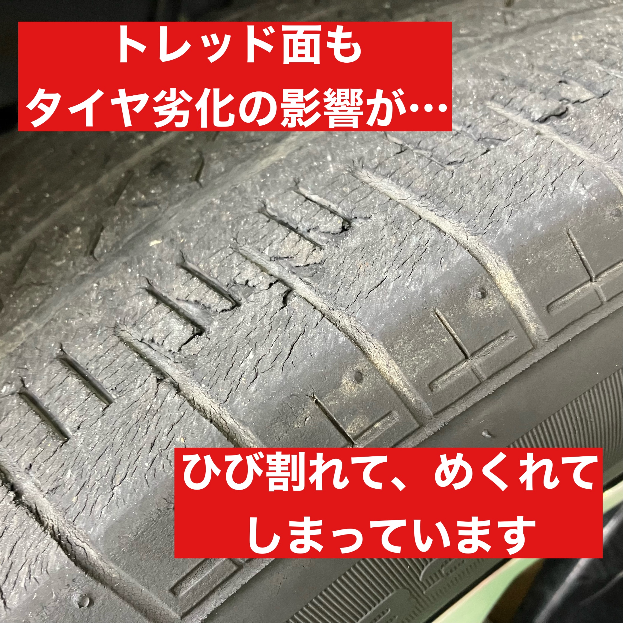 残り溝が少なく、ひび割れもあるため