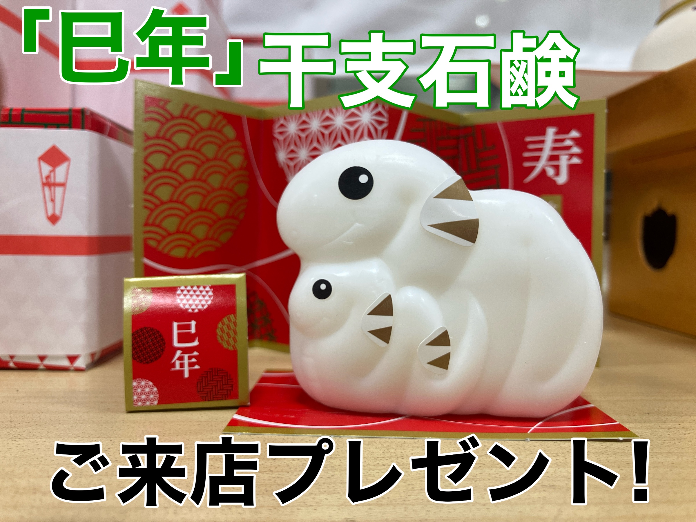 「巳年」のへび型干支石鹸をご来店いただいたお客様にプレゼント!