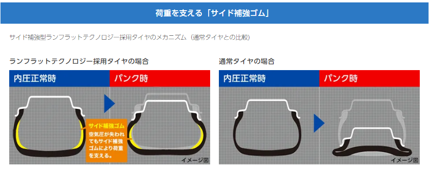 サイド補強ゴムにより、パンクなどで空気圧がゼロになっても
