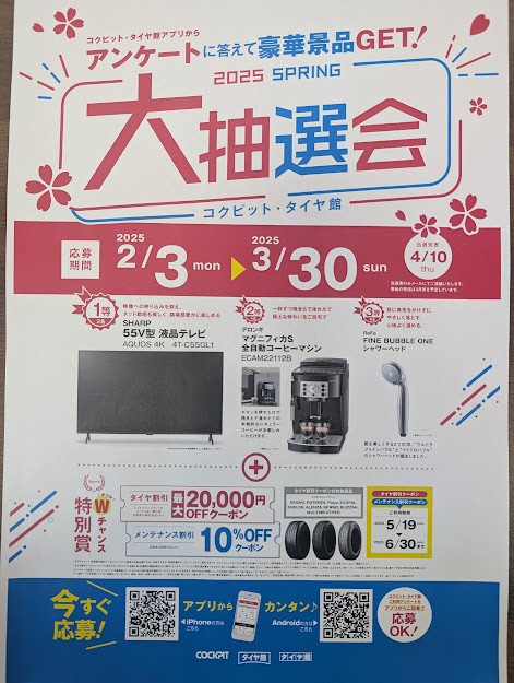 コクピット・タイヤ館アプリからアンケートに答えて豪華賞品GET!