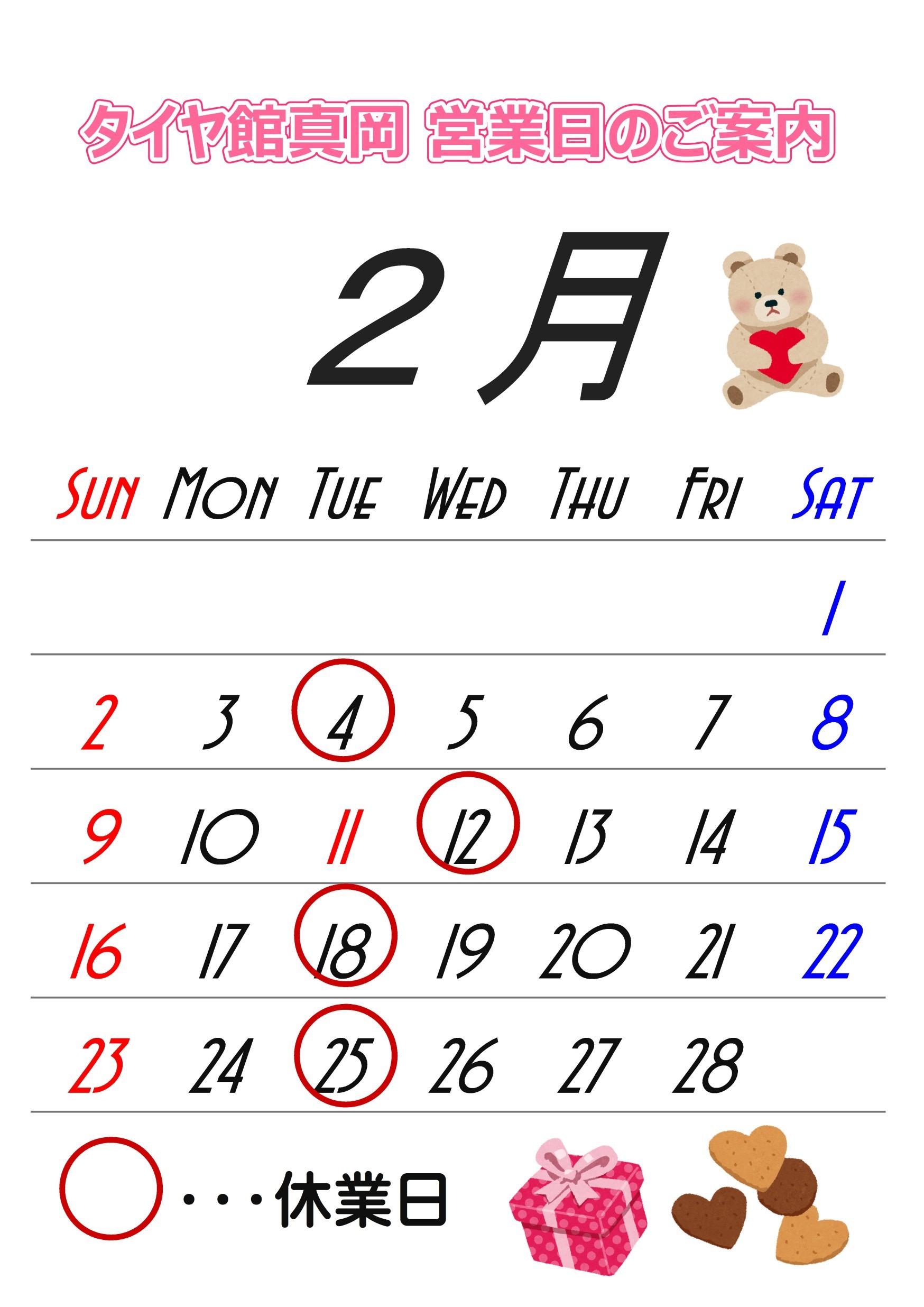 2月の営業日のお知らせ ポスト 2025年2月2日 いつもタイヤ館真岡をご利用いただきありがとうございます。 2月の店休日を下記の通りお知らせいたします。 火曜日 定休日【2月11日(火)は祝日のため臨時営業】 2月12日(水) 臨時休業 ご利用のお客様におかれましては、ご不便をおかけいたしますが ご理解のほどよろしくお願いいたします。 カテゴリ:お知らせ 担当:きゃめい