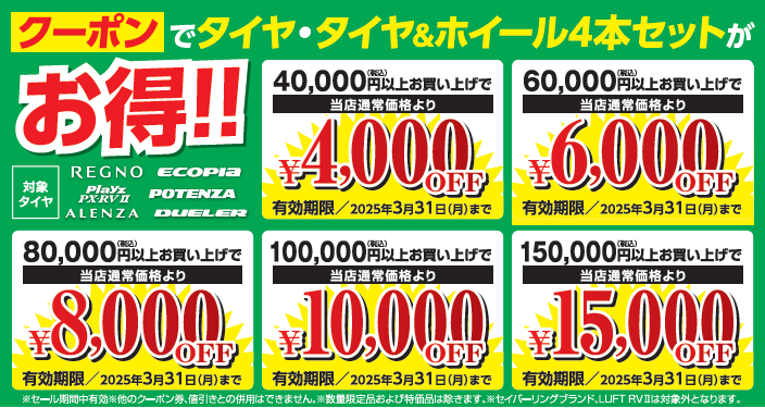 ブリヂストンタイヤフェア~得市期間中3月31日までにブリヂストン製タイヤ4本ご購入のお客様に