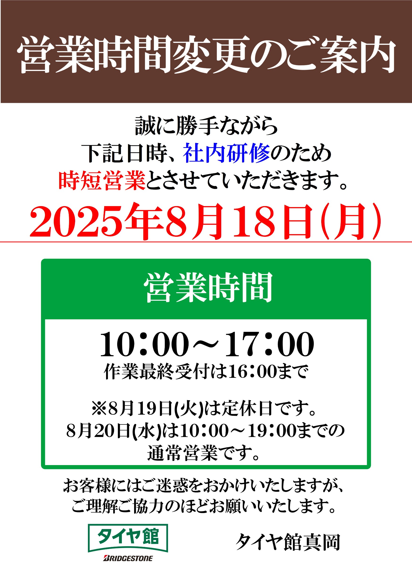 誠に勝手ながら明日8月18日(月)は社内研修のため