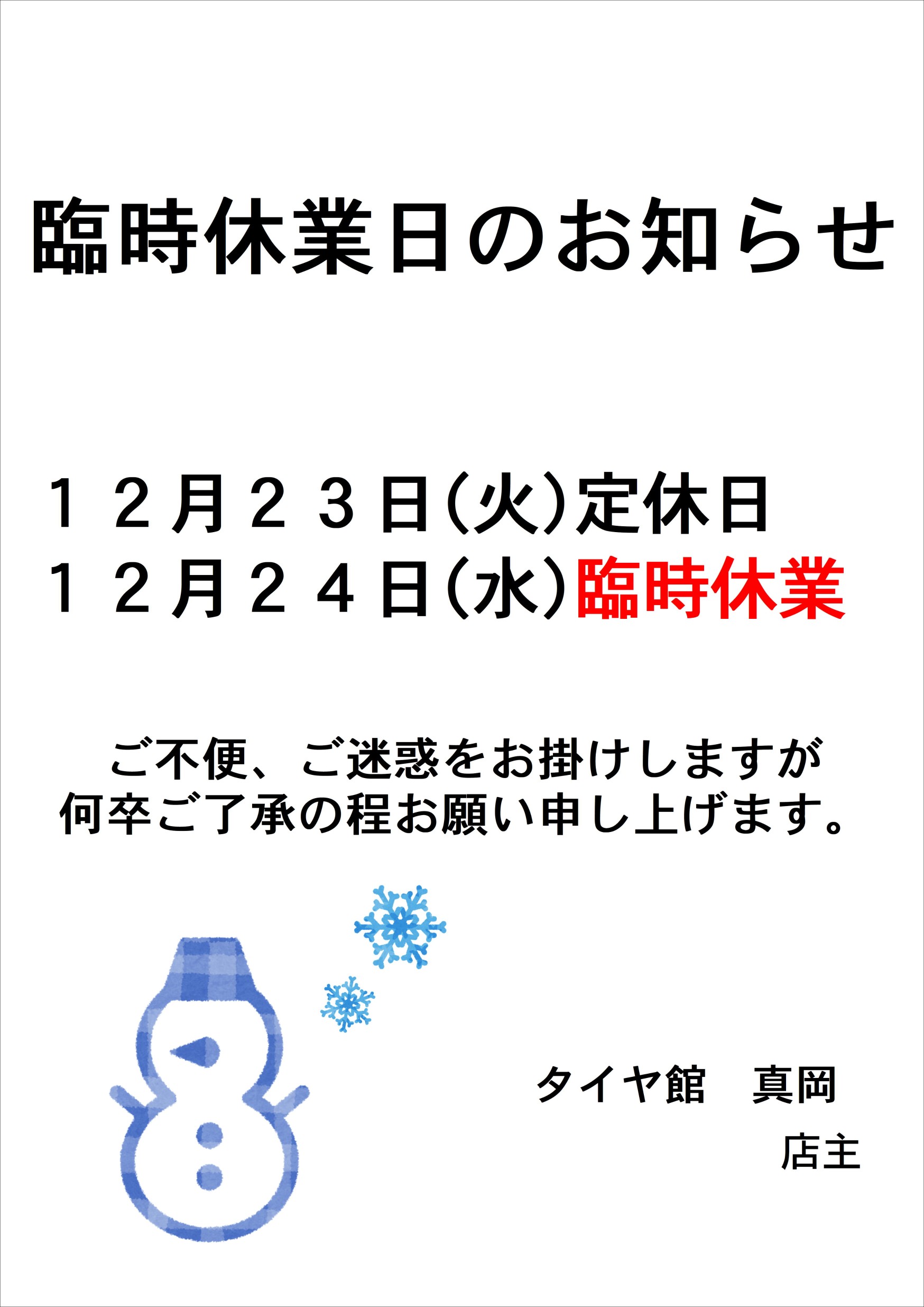 12月24日(水)・・・臨時休業
