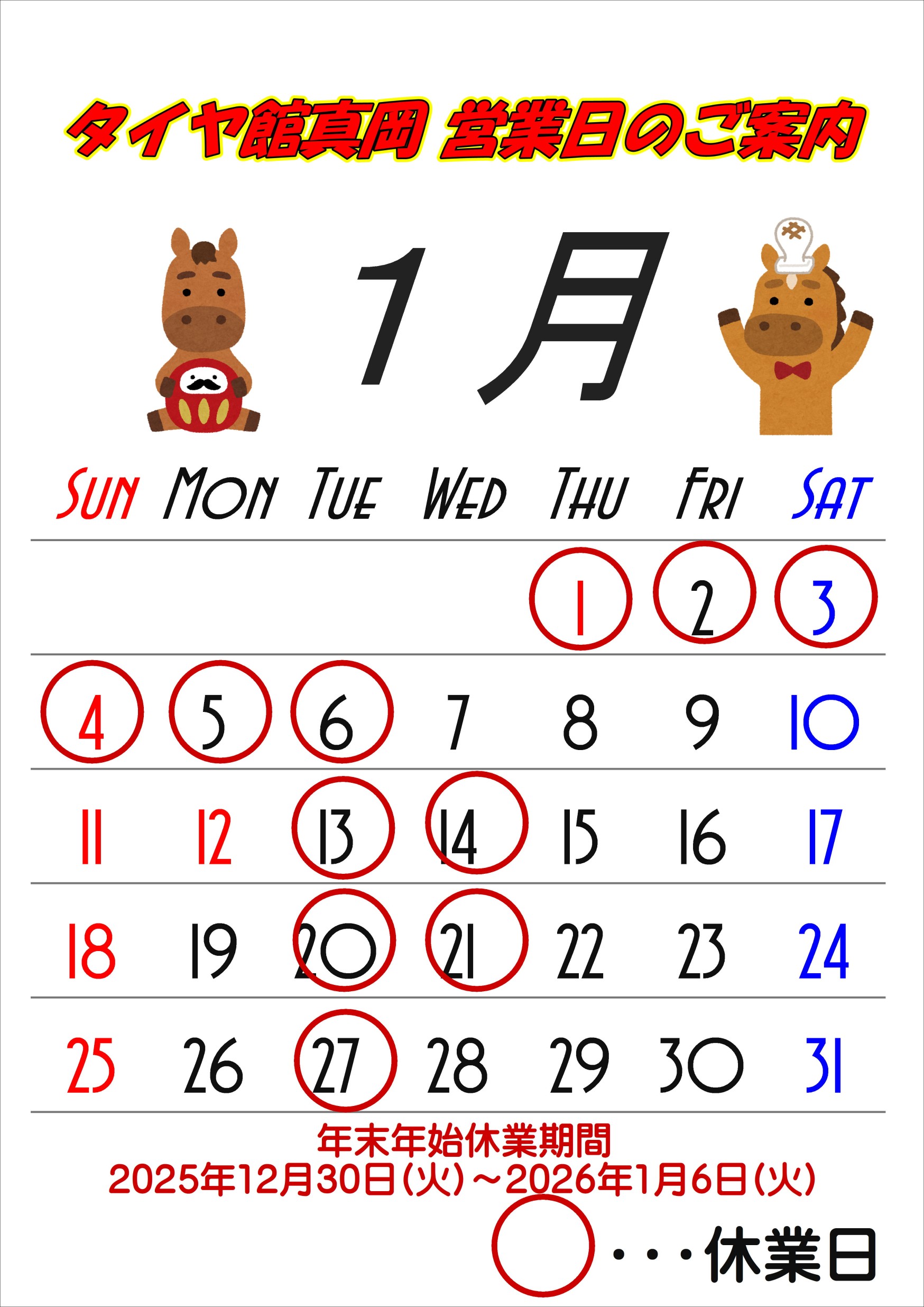 ちょっと早めではございますが、年末年始の営業日をご案内いたします。
