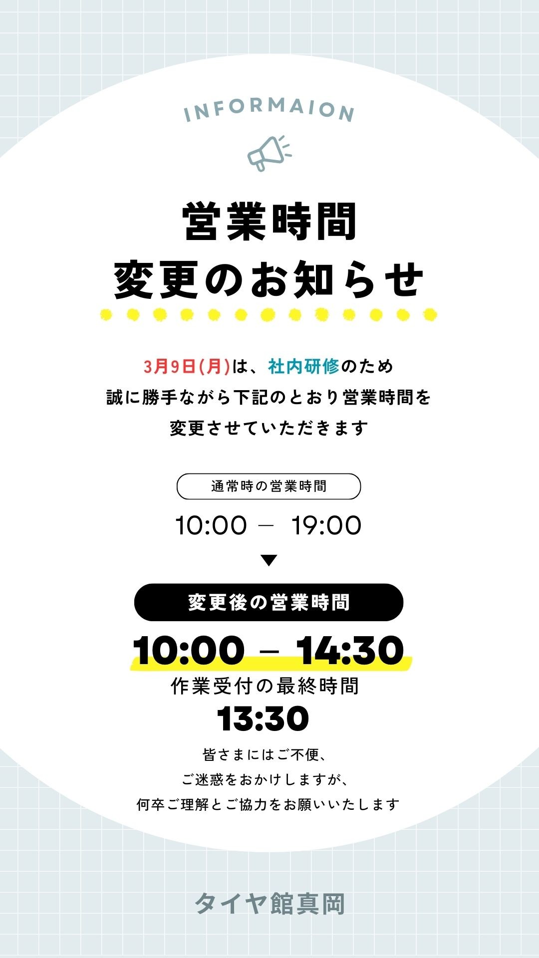 3月9日(月) 営業時間に関するお知らせ