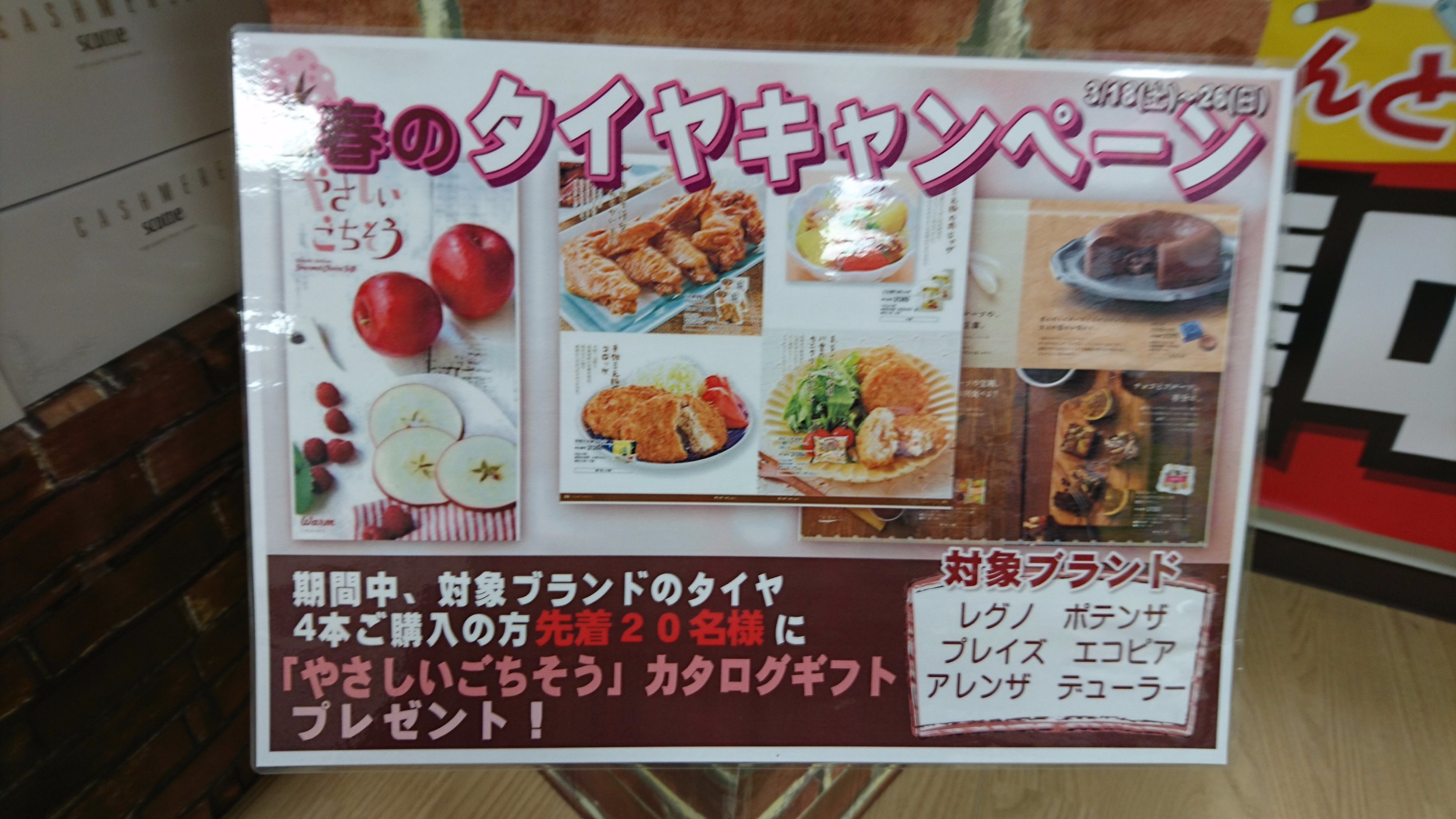 集中得市開催! ポスト 2017年4月15日 こんにちは! やってきました、春の集中得市第2弾! タイヤ購入をご検討のお客様、お待ちしております! 6月にはタイヤの値上げがございます!買うなら今です! そして、前回ご好評いただきました、「やさしいごちそう」カタログギフト! 対象商品(エコピア、プレイズ、アレンザ、デューラー、ポテンザ、レグノ)をご購入いただいたお客様へプレゼントいたします! 先着20名様ですのでお早めに! 皆様のご来店をお待ちしておりますm(__)m 担当:店長H
