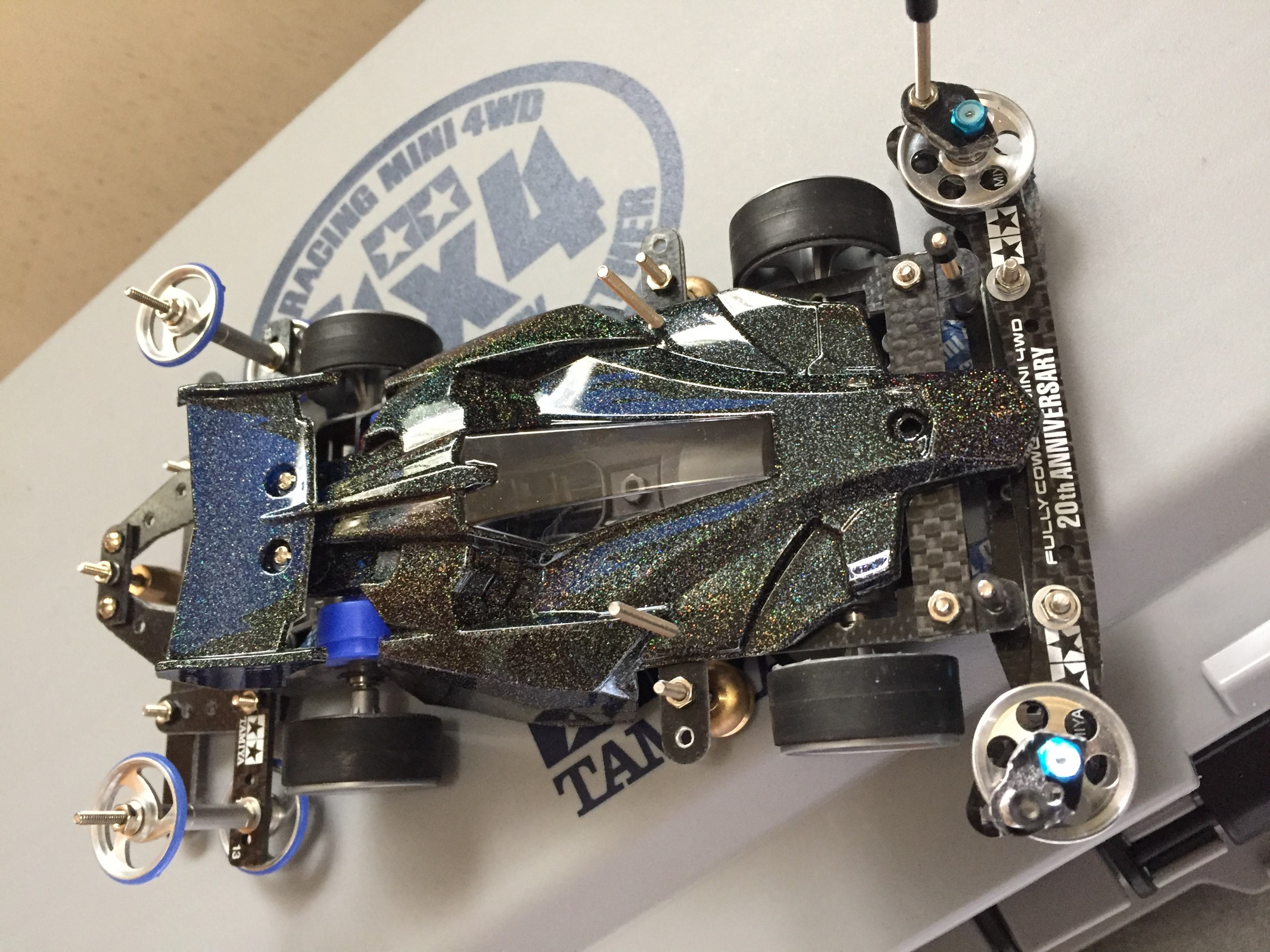 ポリカボディにラメ吹いてからマスキングしてブラック吹いた後にマスキングを剥がしてダークブルーを吹いてファイアーパターンにしようと思ったら(汗)